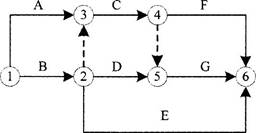 (6)共用母线:当双代号网络图的某些节点有多条外向箭线或多条内向箭线时,可采用母线法绘制。
