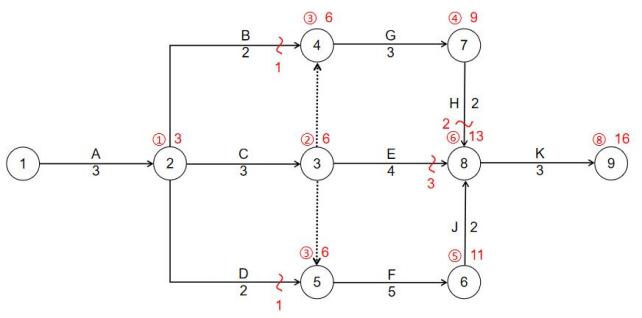 2)标出各工作自由时差:波浪线的长度即为自由时差;