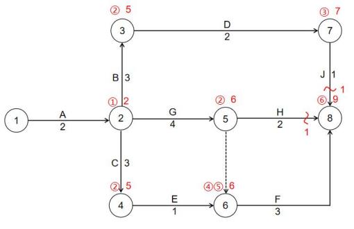 (1)所谓标号法,是指利用按节点计算法的基本原理,对网络计划中的每一个节点按顺序进行标号,然后利用标号值确定网络计划的计算工期和关键线路。计算过程如下: