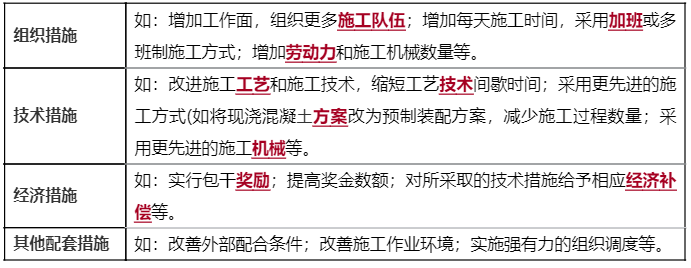 为压缩某些工作的持续时间,通常需要采取以下措施来达到目的: