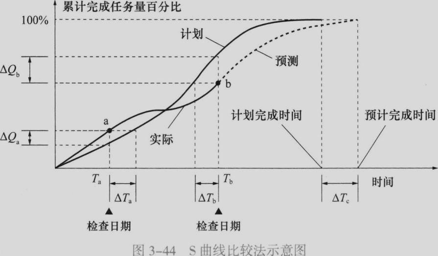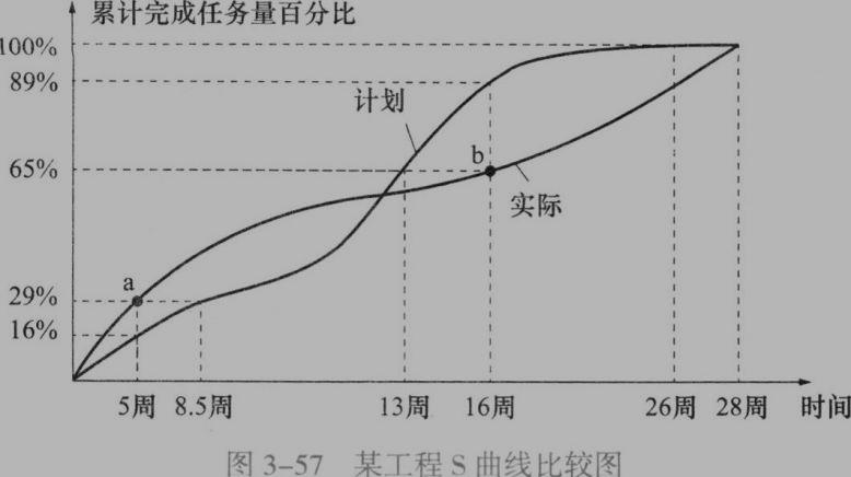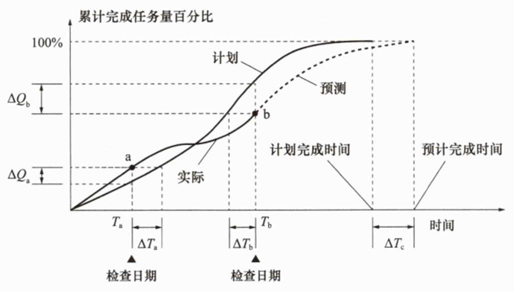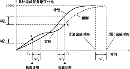 ②若工程实际进展点落在计划S曲线右侧(b点),表明此时实际进度拖后。