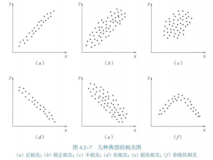 非线性相关(图f):呈一曲线带,即在一定范围内x增加y也增加;超过这个范围后,x增加y下降。