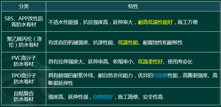 答察解析: A选项:SBS 、APP改性沥青防水卷材具有不透水性能强,抗拉强度高,延伸率大,耐高低温性能好,施工方便等特点。