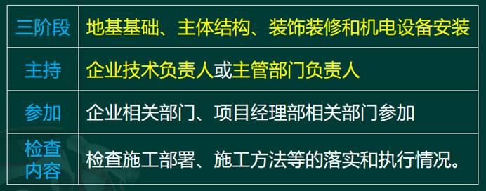E选项:过程检查由企业技术负责人或主管部门负责人主持,企业相关部门、项目经理部相关部门参加,检查施工部署、施工方法等的落实和执行情况,如对工期、质量、效益有较大影响的应及时调整,并提出修改意见。
