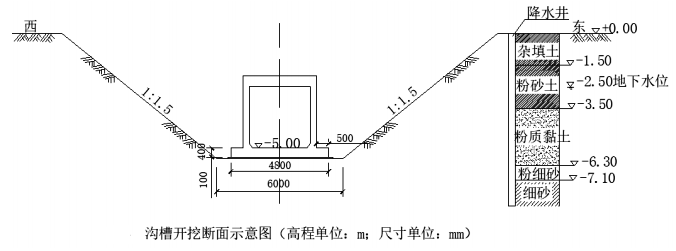 2、在西侧增设一排降水井,槽顶增设挡水墙、截水沟,槽底增设集水井、排水沟。