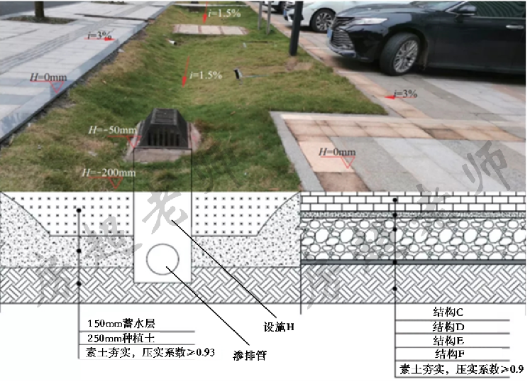 (2)下沉式绿地应低于硬化地面100~200mm,设施H的顶口应高出绿地50~100mm。