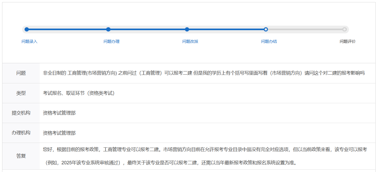 问:非全日制的 工商管理(市场营销方向) 之前问过(工商管理)可以报考二建 但是我的学历上有个括号写里面写着(市场营销方向)请问这个对二建的报考影响吗