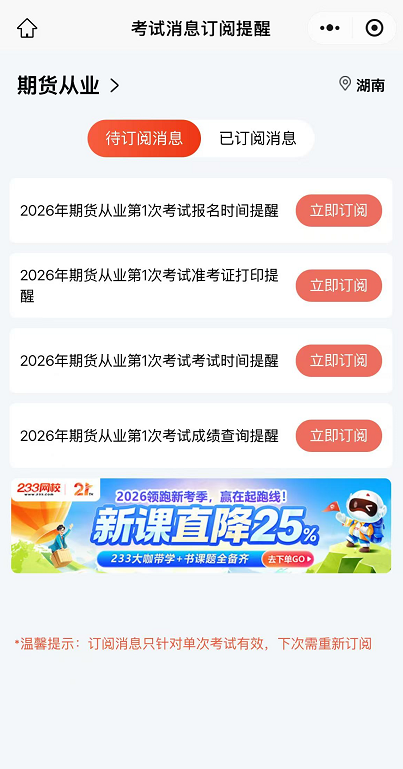 2026年仅1次期货从业资格全国统一考试,大家务必提前关注,抢先报名!如果担心错过2026年期货从业考试报名,大家可以通过233网校免费订阅考试提醒,免费获得期货考试时间、报名、准考证、成绩查询提醒服务!233网校老师将于官方公布时间后即时发送提醒,以便大家不错过每一个考期!