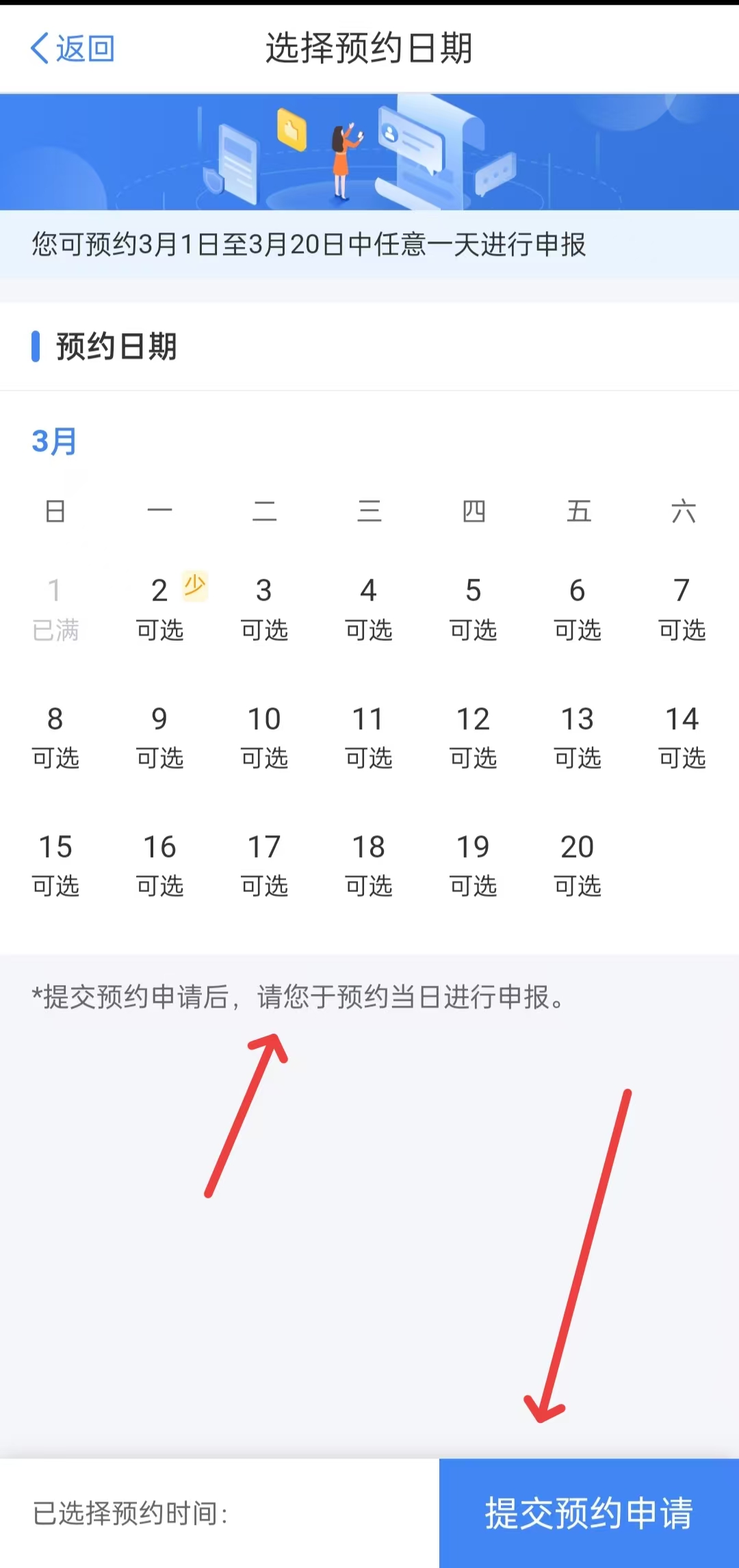 3、选择您希望申报的日期(可以预约3月1日-3月20日任何一天,如预约已满则不可预约),点击“提交预约申请”完成预约。