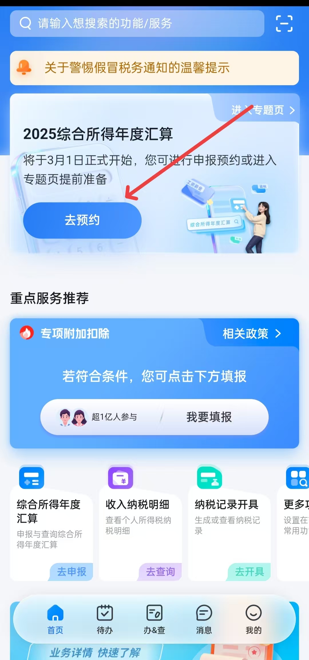 2、个人所得税APP点击首页专题区域的“去预约”按钮。