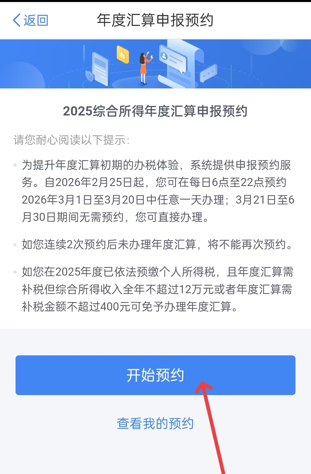 为提升年度汇算初期的办税体验,系统提供申报预约服务。自2026年2月25日起,您可在每日6点至22点预约2026年3月1日至3月20日中任意一天办理;3月21日至6月30日期间无需预约,您可直接办理。如您连续2次预约后未办理年度汇算,将不能再次预约,如您在2025年度已依法预缴个人所得税,且年度汇算需补税但综合所得收入全年不超过12万元或者年度汇算需补税金额不超过400元可免予办理年度汇算。