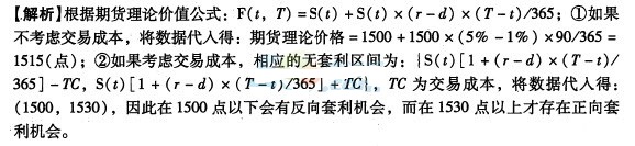 8.假设4月1日现货指数为1500点,市场利率为5%,交易成本总计为15点,年指数股息 率为1%,则( )。
