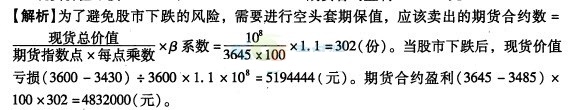4.某投资基金预计股市将下跌,为了保持投资收益率,决定用沪深300指数期货进行套期 保值。该基金目前持有现值为1亿元的股票组合,该组合的β系数为1.1,当前的现货 指数为3600点,期货合约指数为3645点。一段时间后,现货指数跌到3430点,期货合 约指数跌到3485点,乘数为100元/点。则下列说法正确的有( )。