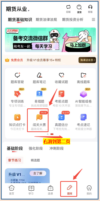 2、活动参与方式:本活动须在233网校APP参与,打开233网校app——题库——闯关大赛。如图示所在位置:
