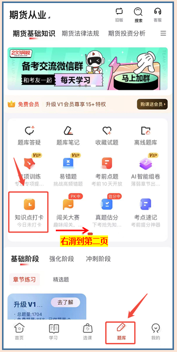 2、活动参与方式:本活动须在233网校APP参与,打开233网校app——题库——知识点打卡——加入打卡计划。如图示所在位置: