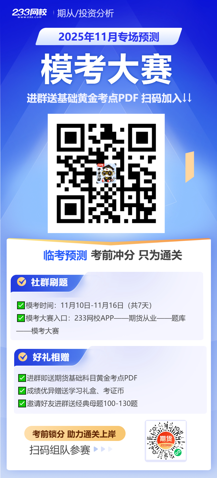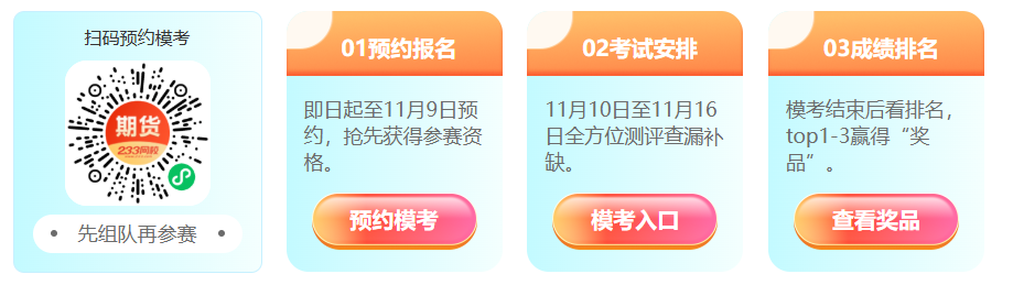 11月10日,期货模考大赛训练营同步开启,模考期间,社群会每日带学。进群即赠送期货基础黄金考点PDF版。扫下方二维码即可加入模考大赛社群。