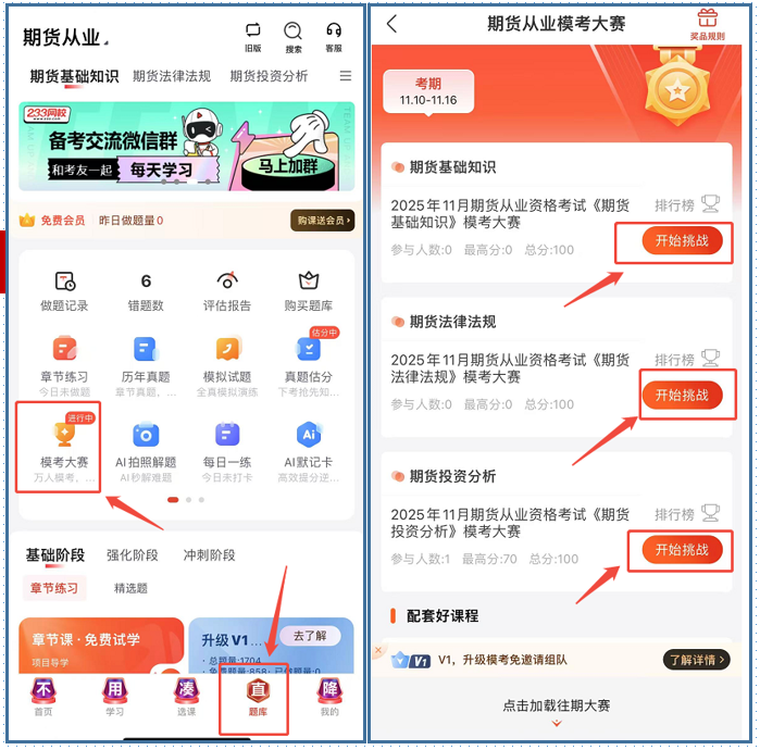 2️⃣ 参与方式:登录233网校APP——期货从业考试——题库——模考大赛——选择对应科目(期货投资分析/基础+法规)——组队——开始答题,冲刺高分!