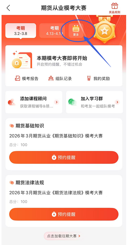 第二步:找到参赛科目,点击【预约提醒】。注意:本页面右上角有【奖品规则、组队记录、我的奖励】等入口,也可以加入期货从业学习群。