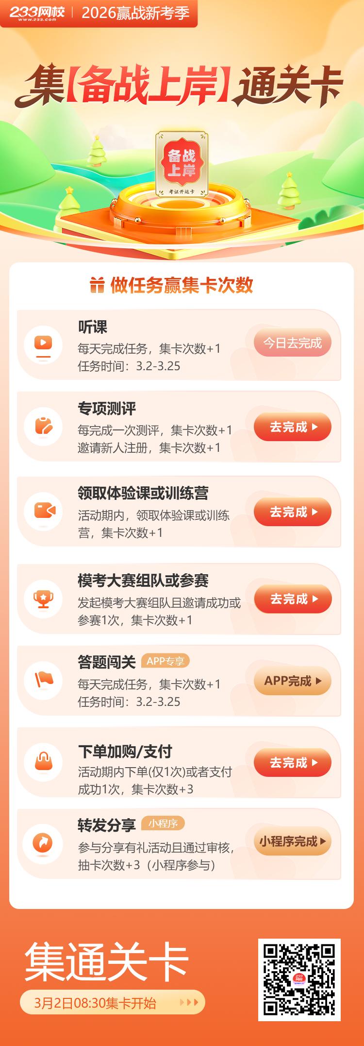 三月备考启幕,2026年期货从业资格备考正式进入黄金起步期。不少考生刚翻开教材,刷题量尚浅,面对知识点难免心生慌乱,但别慌。此时一份正向激励,既能缓解焦虑,又能助力稳步启程,233 网校「备战上岸」集卡抽好礼活动,恰好为备考之路添动力、增盼头。