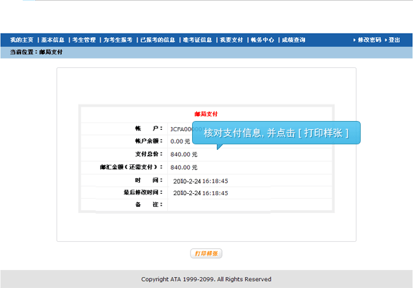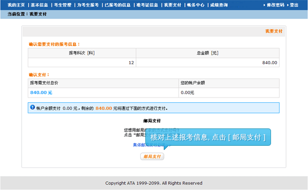 1、邮局汇款汇到考试机构ATA公司的考试报名缴款专用客户号