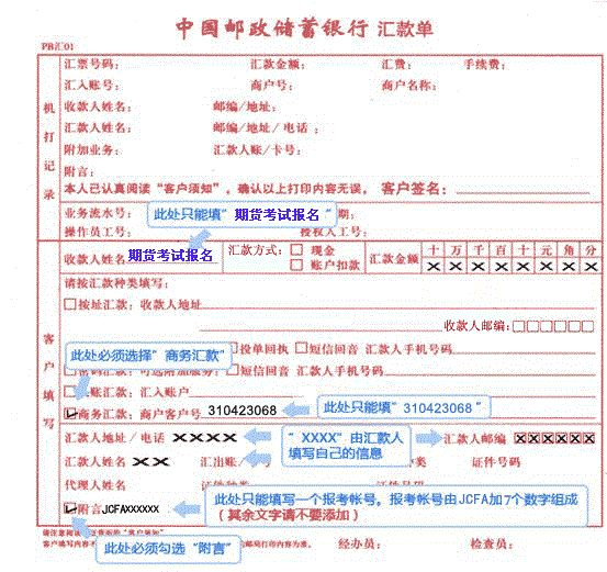 ( 收款人:期货考试报名,汇款方式:商务汇款,商户客户号:310423068)