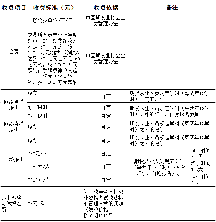 中国期货业协会关于会费收取、网络点播培训、网络直播培训、面授培训、从业资格考试报名费用标准的说明如下: