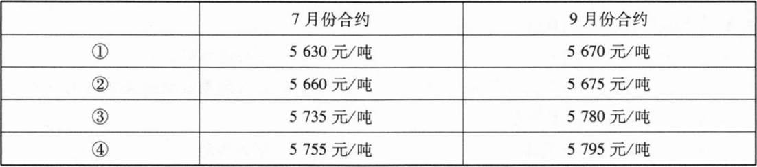 答案解析: 如果套利者预期两个或两个以上期货合约的价差将扩大,则套利者将买入其中价格较高的合约,同时卖出价格较低的合约,我们称这种套利为买入套利。①的价差为40元/吨,②的价差为15元/吨,③的价差为45元/吨,④的价差为40元/吨。