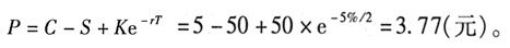 将数据代入公式可得:5+50×e-5%×0.5=P+50,