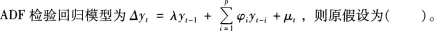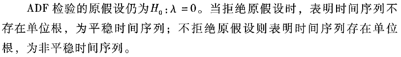 答案解析: ADF检验的原假设为H0:λ=0,即当拒绝原假设,表明序列不存在单位根,为平稳性时间序列;不拒绝原假设,表明序列存在单位根,为非平稳性时间序列。