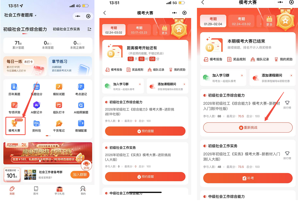 ▲APP会定期举办免费全真模考大赛,参与模考不仅能同场竞技,了解自己的备考排名和水平,还能配套观看名师直播讲题,直击易错点,快速弥补漏洞。