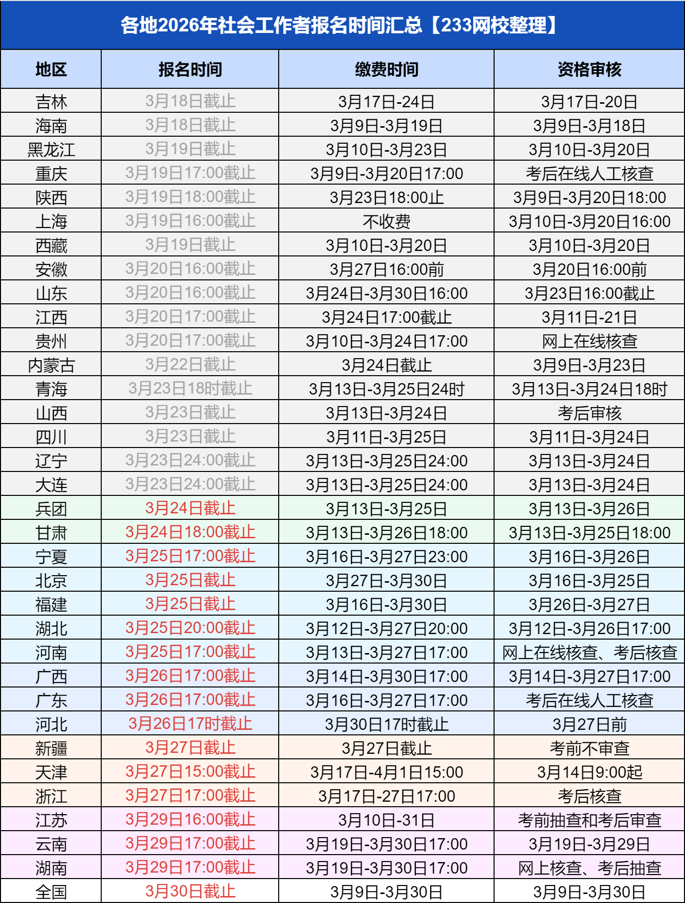 2026 年社会工作者考试报名已进入最后倒计时,多地报名入口已关闭!部分地区也即将截止,一年仅一次报考机会,逾期系统将不再接受任何补报。请尚未完成报名、缴费的考生,立即登录中国人事考试网提交信息,避免因网络拥堵、审核延误错失报考资格。