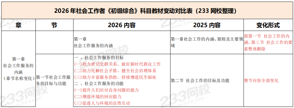 中国人民大学出版社2026年度社会工作者职业资格考试指导教材已正式出版发行。233网校教研团队依托多年备考辅导经验,对新版教材开展深度研读工作,同时与2025年版教材进行全方位对比分析,系统梳理出各科目教材核心变化。以下是人大版2026年《初级社会工作综合能力》教材的具体变动情况。