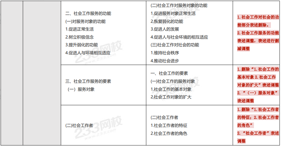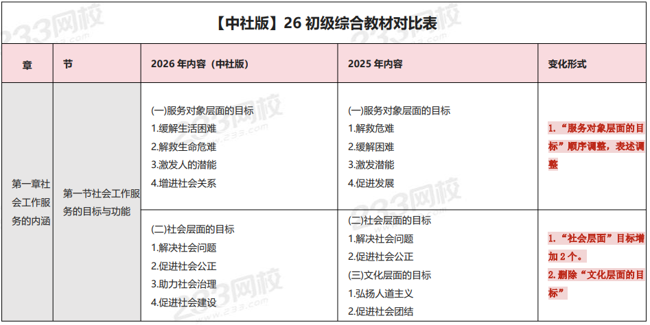 中国社会出版社2026年度社会工作者职业资格考试指导教材已正式出版发行。233网校教研团队依托多年备考辅导经验,对2026版教材开展深度研读工作,同时与2025年版教材进行全方位对比分析,系统梳理出各科目教材核心变化。以下是中社版2026年《初级社会工作综合能力》教材的具体变动情况。