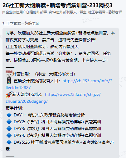 备考2026年社工考试,选对平台 + 找对方法 = 成功一半!现在扫码入群,让双师护航、干货加持、考友同行,快速把握新大纲核心,开启通关之旅,拿下社工证书!