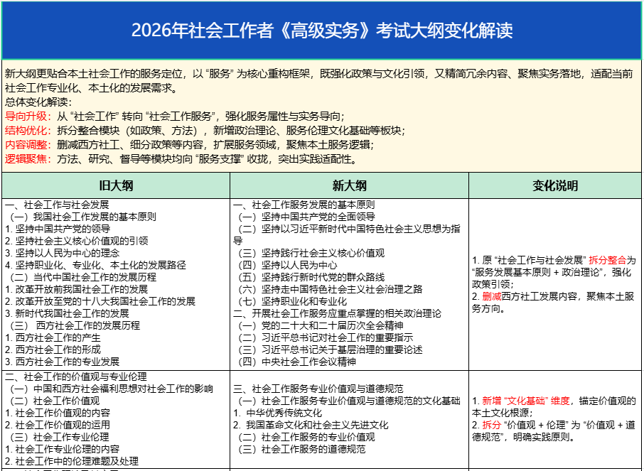 因篇幅有限,想获取2026年社会工作师考试新大纲变化及pdf版,可以加入【大纲解读集训营】获取!