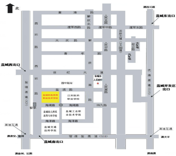 ②市区乘BRT-B1至职教园下车向西500米;1路、33路公交车在盐城机电高职南门下车;