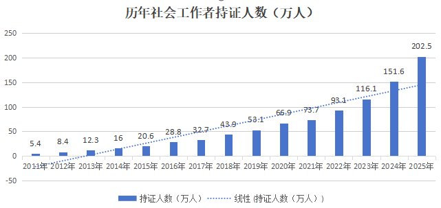 从中央社会工作部有关部门负责同志就修订后的《社会工作者职业资格考试大纲》答记者问中获悉,截至目前,全国累计有202.5万人通过考试取得职业资格证书,形成了一支具有一定规模的专业力量。