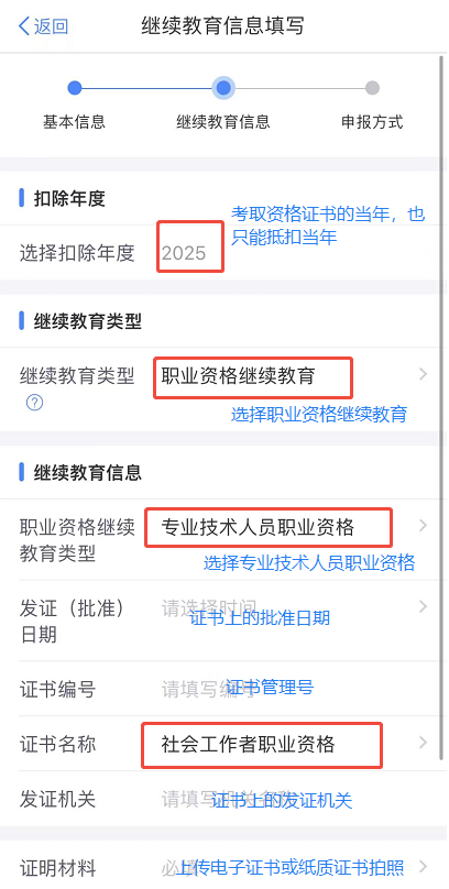 继续教育类型选择【职业资格继续教育】,职业资格继续教育类型选择【专业技术人员职业资格】,证书名称选择【社会工作者职业资格】。