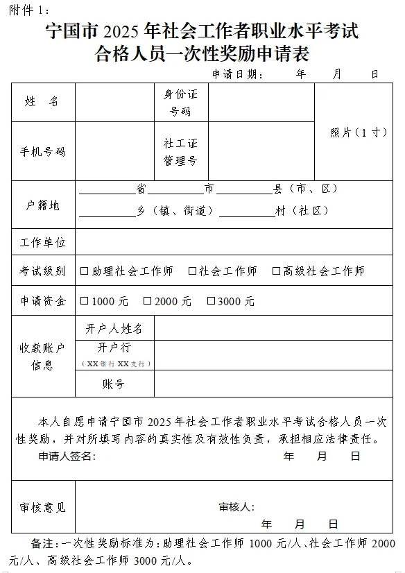 1.宁国市2025年社会工作者职业水平考试合格人员一次性奖励申请表(自行打印填写)