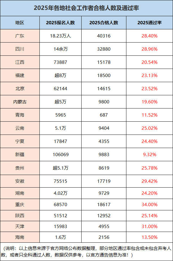 根据历年情况来看,社会工作者通过率在10%-30%,每年全国各地报考社会工作者的人数不同,因此合格率也会有所区别。根据已公布的名单及报考人数统计,2025年各地社会工作师考试通过率,同比2024年有增,有的地区通过率超30%。