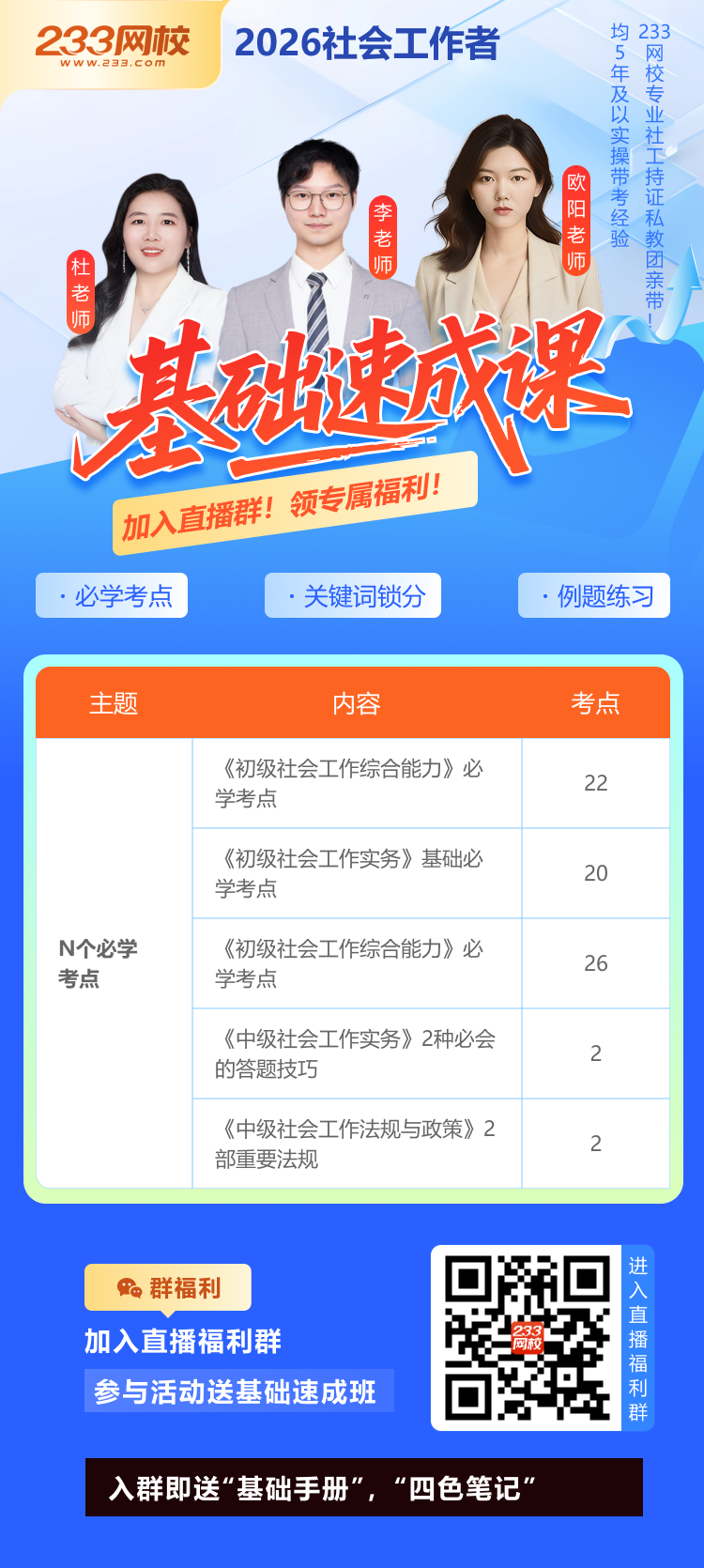 进入直播群送2026社工《固基础手册》,直播当天送《四色笔记》,同时可以参与活动【基础速成班】。