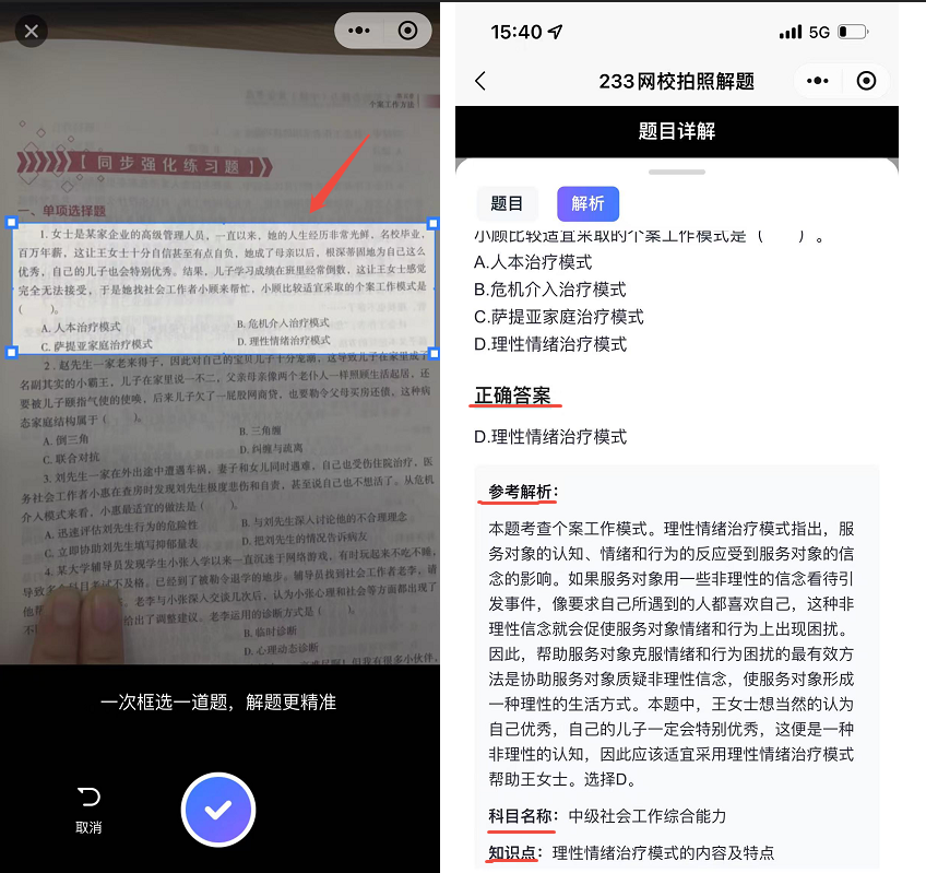 只需对准社工难题轻轻一拍,AI引擎瞬间精准识别题目。不仅秒出标准答案,更把核心考点拆解、解题思路梳理、考点依据标注一一呈现,让你不仅知其然,更知其所以然!