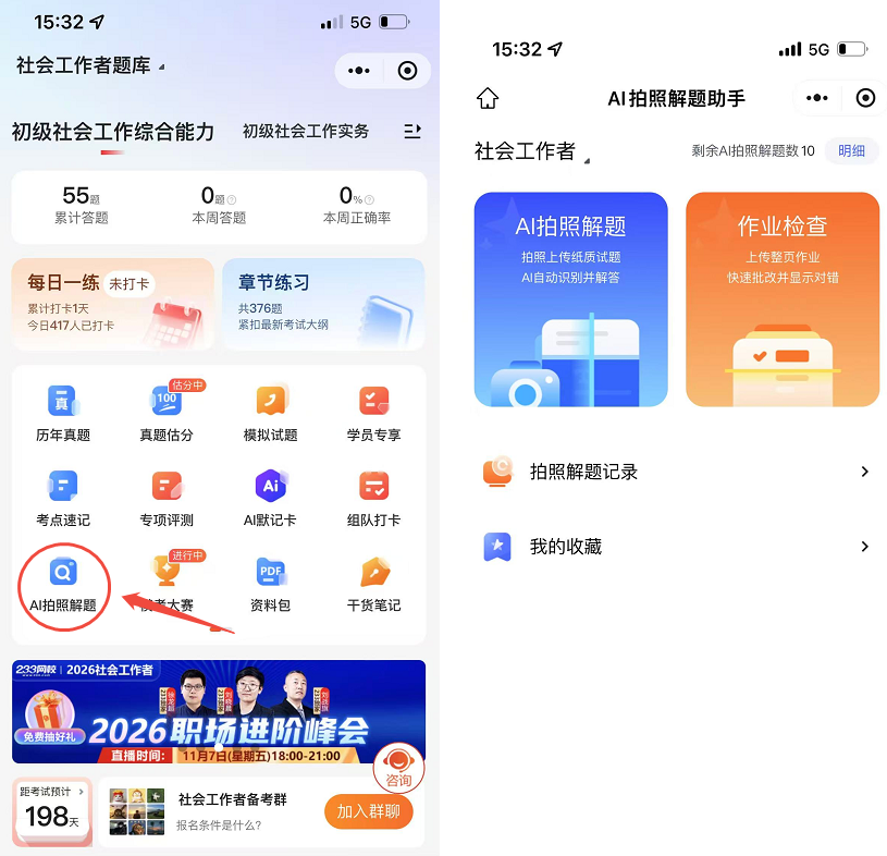 现在,不用再独自硬扛!233 网校专为社工考生定制的「AI拍照解题」智能工具重磅上线,它就是你备考路上随叫随到的专业助教,帮你高效突破备考难关!