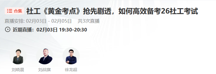 刘晓晨、徐龙超、刘战旗老师带着《黄金考点7.0》的重磅剧透来啦!2月3日-2月5日(19:30)锁定直播间,不仅能抢先get社工考试新考点、新趋势,还有高效备考方法和惊喜互动等着你~这波剧透千万别错过,让你备考赢在起跑线!