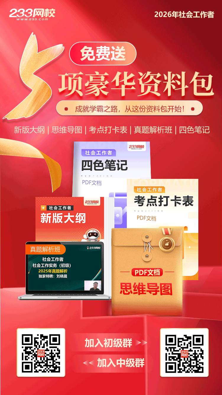 五项豪华资料包主要包括:思维导图➕四色笔记➕考点打卡表➕新版大纲➕真题解析班,内容丰富、质量上乘,为大家在社工备考路上助力。