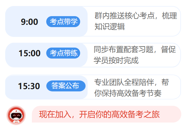 专属学习群同步开启带学带练服务,彻底解决备考无人指导、容易半途而废的难题。专业带学老师每日在群内推送核心考点,让零基础学员也能快速入门;同步布置配套习题,督促学员按时完成、及时复盘。