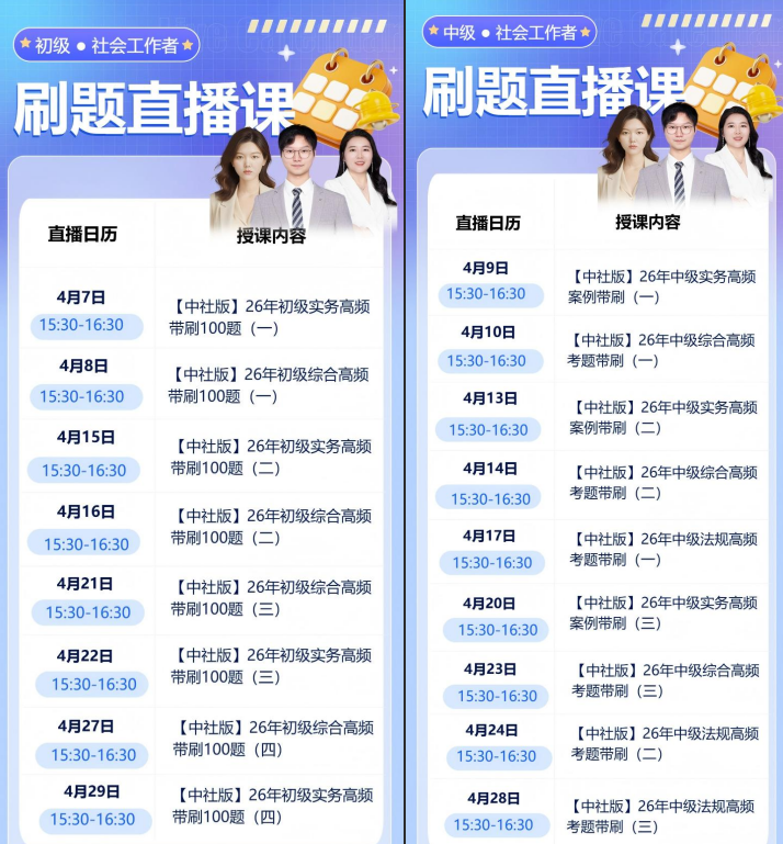 ↓↓初中级社工刷题直播课表↓↓