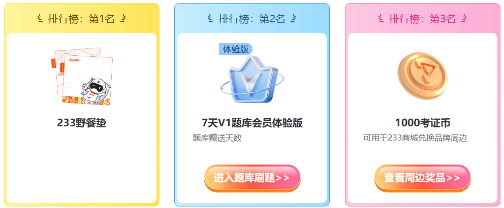 ✅ 第3名:领取1000考证币,可在233网校商城兑换备考资料、品牌周边等实用好物;