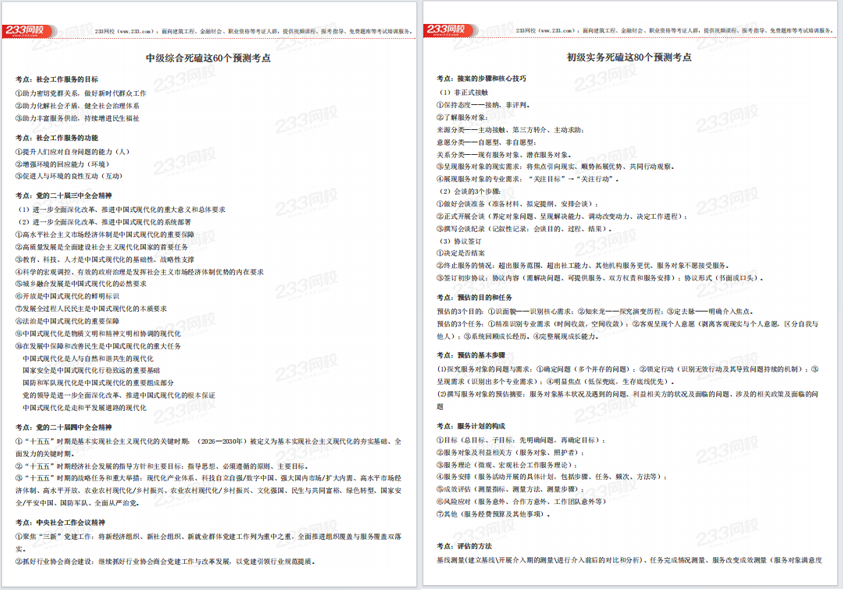 2026社工考试备考进入冲刺期,最忌盲目刷题、分散精力!与其在海量知识点中“大海捞针”,不如锁定核心预测考点,今天,60s速记挑战正式开启,初级、中级全科目核心考点已整理完毕,所有预测考点均精选自233网校资料默写本,帮你高效冲刺、少走弯路!