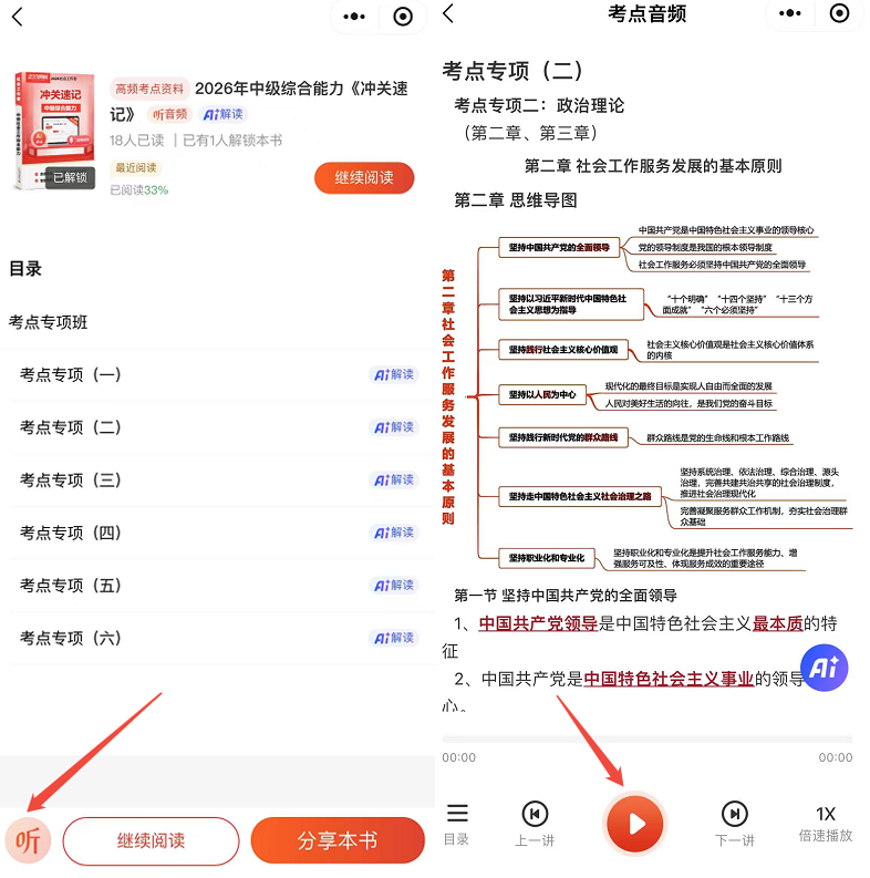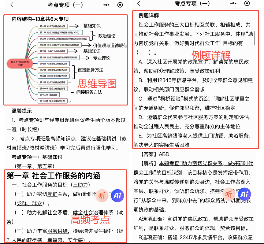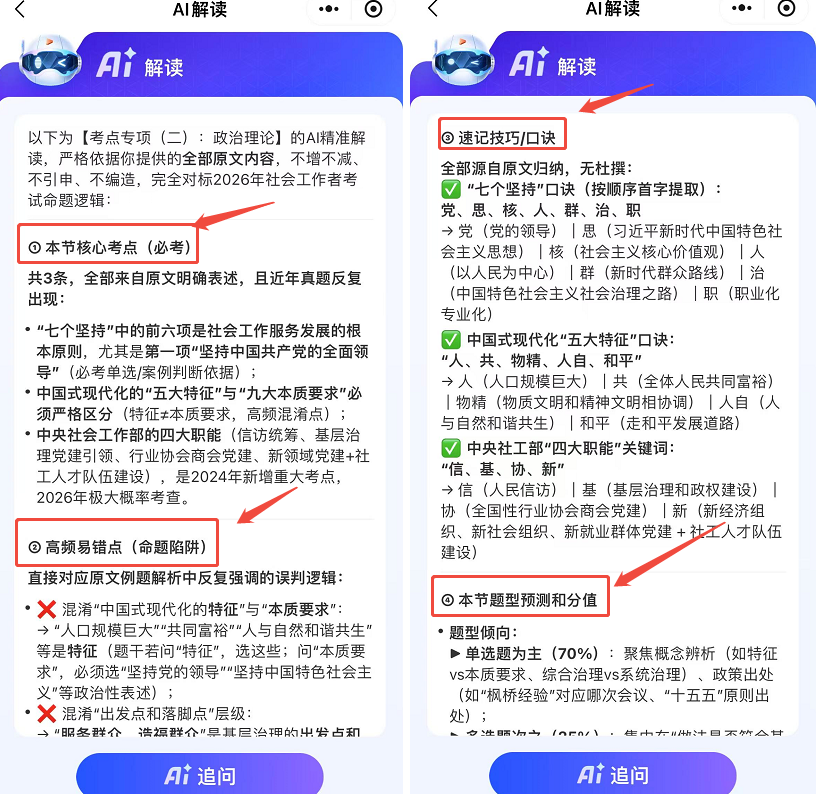 1、精准划重点。26版社工干货笔记的AI智能解读功能,它会自动梳理每一个核心考点,划重点、圈难点,让你一眼看清哪些是必考内容、哪些是高频考点,不用再在无关知识点上浪费精力;